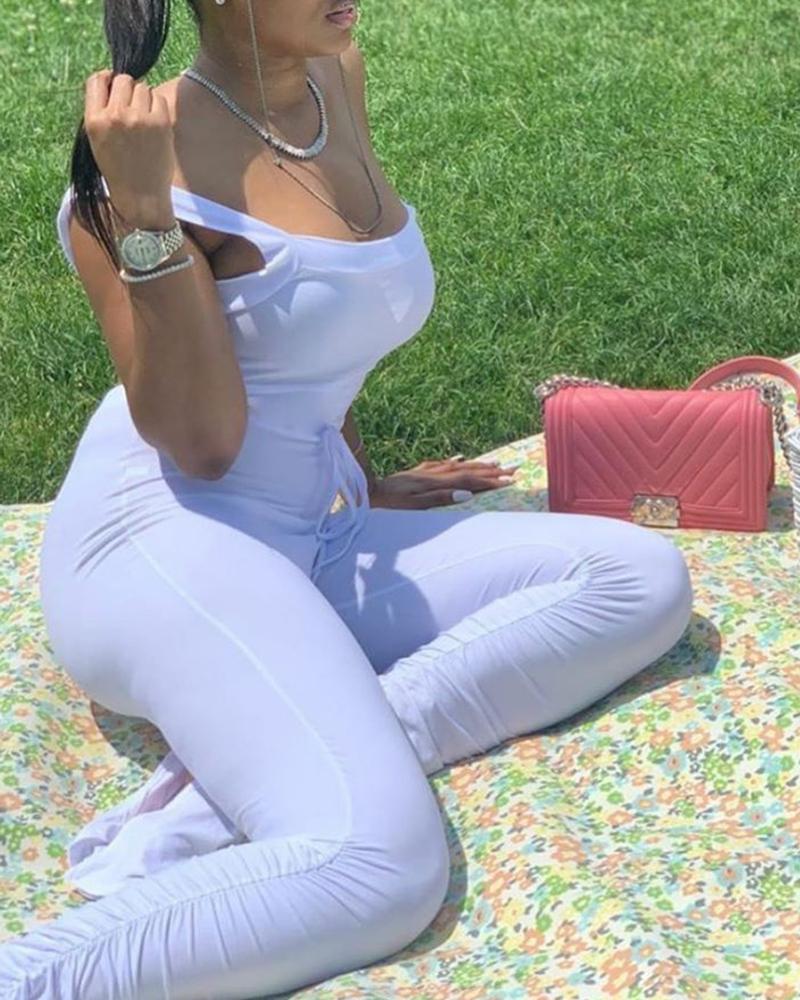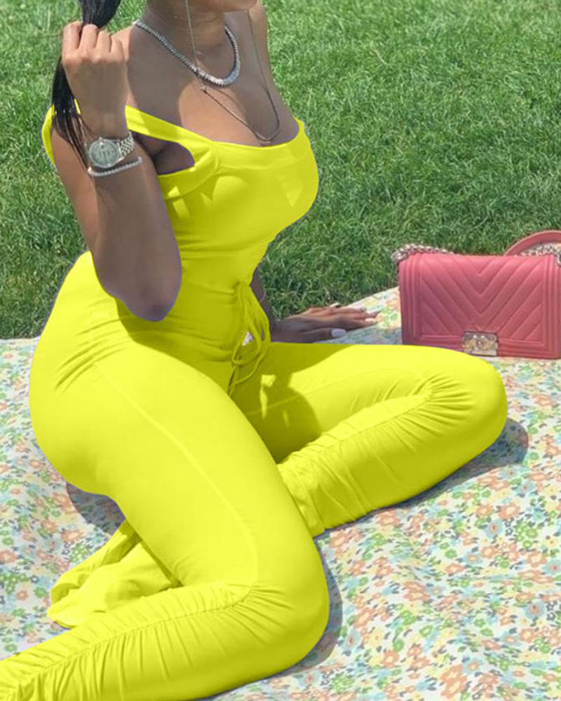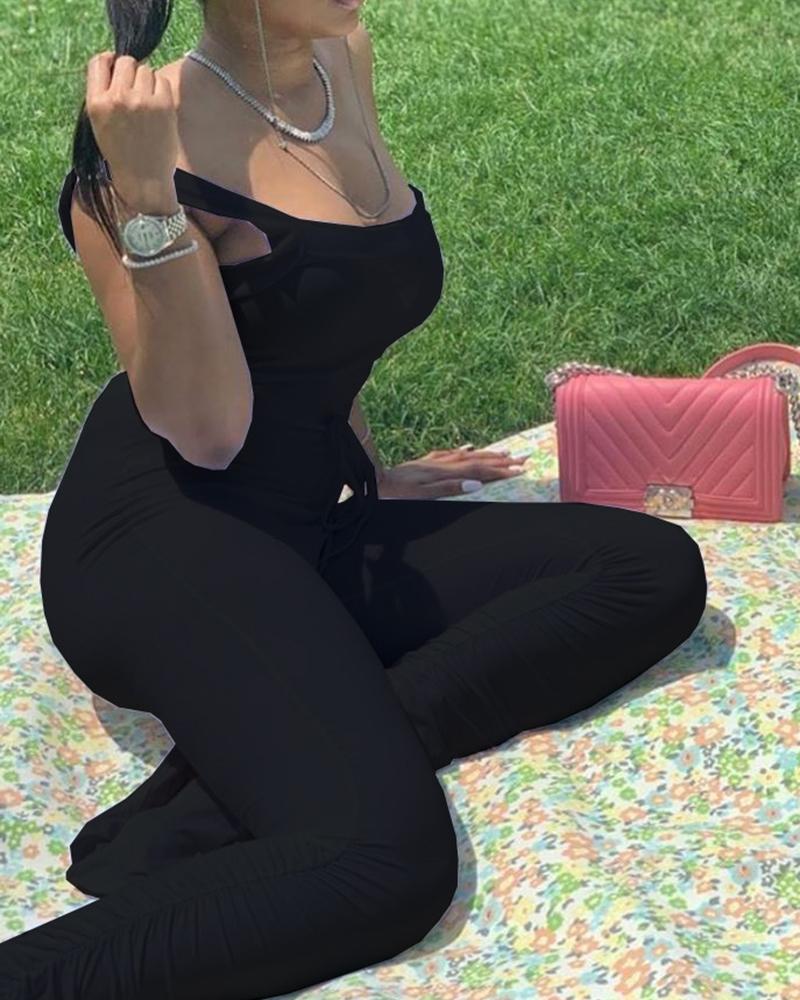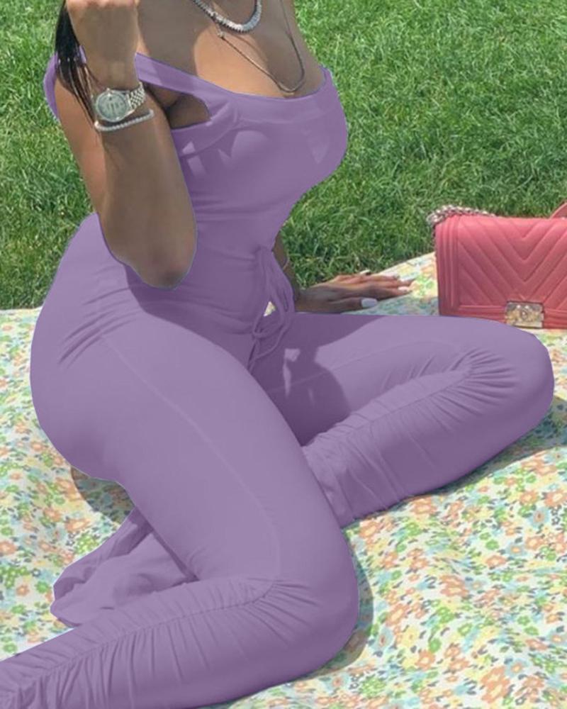 Solid Drawstring Waist Ruched Split Hem Straps Casual Jumpsuit