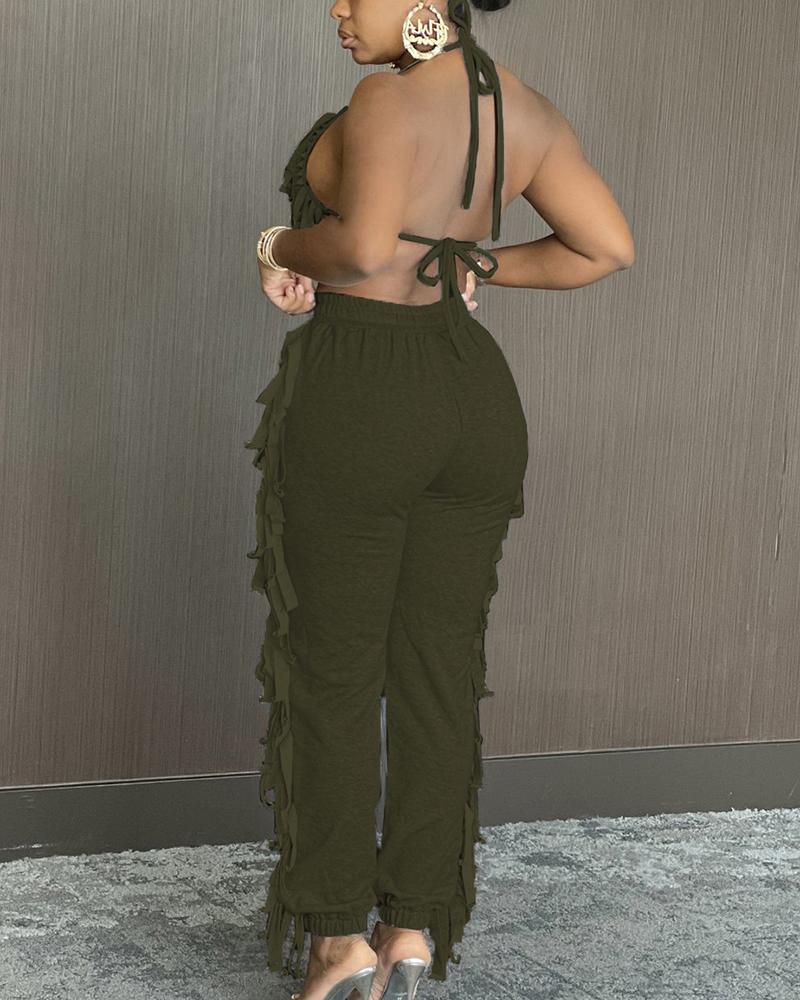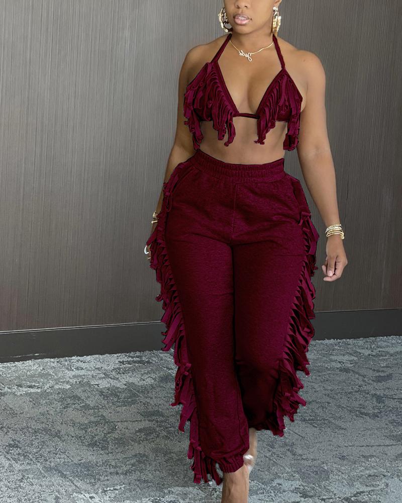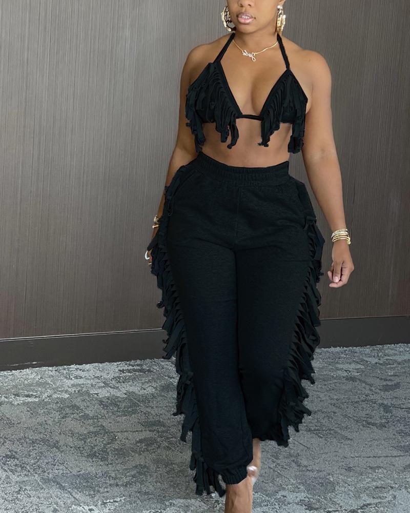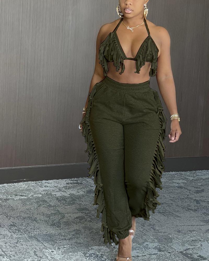 Solid Fringe Self-Tie Halter Top & Pants Set