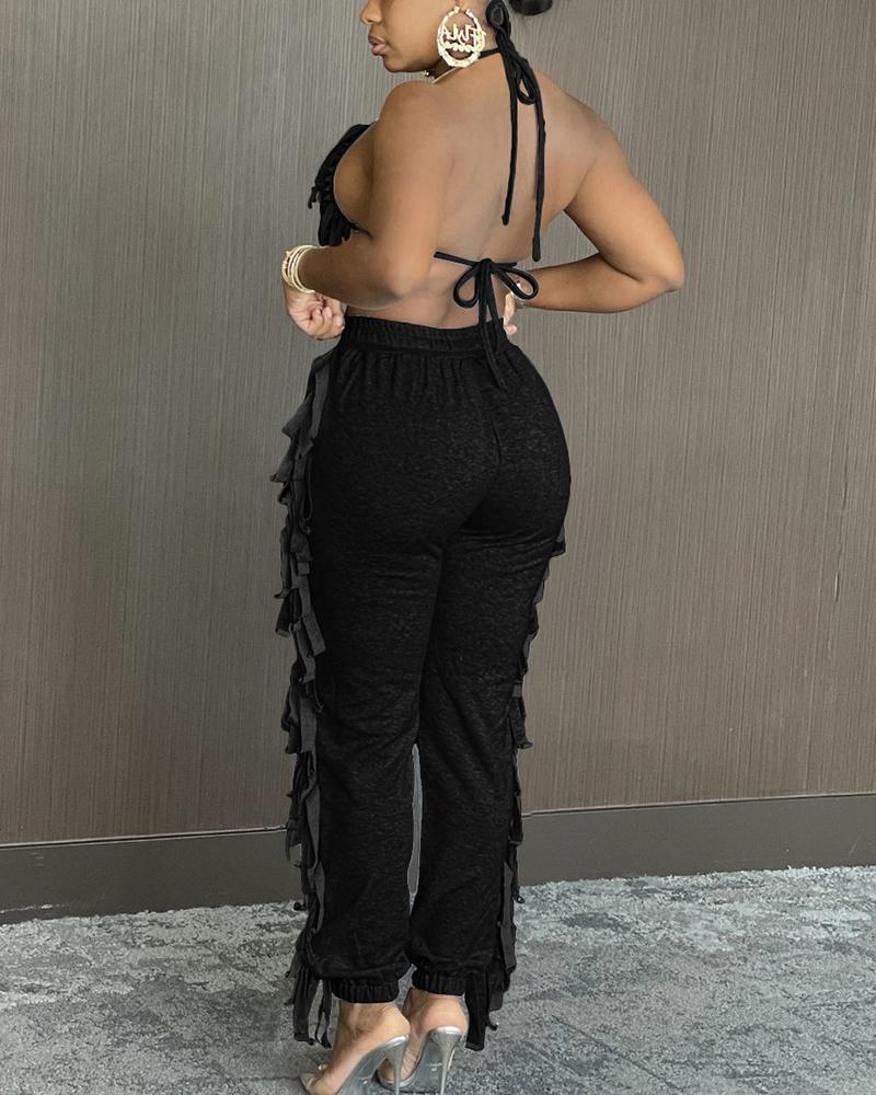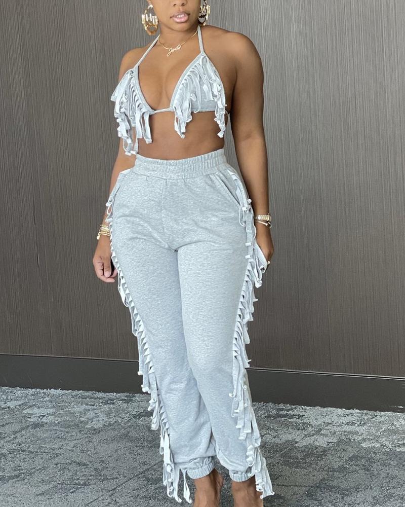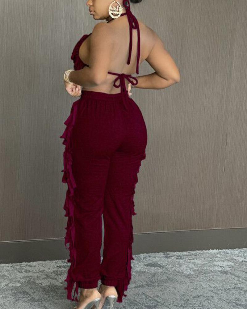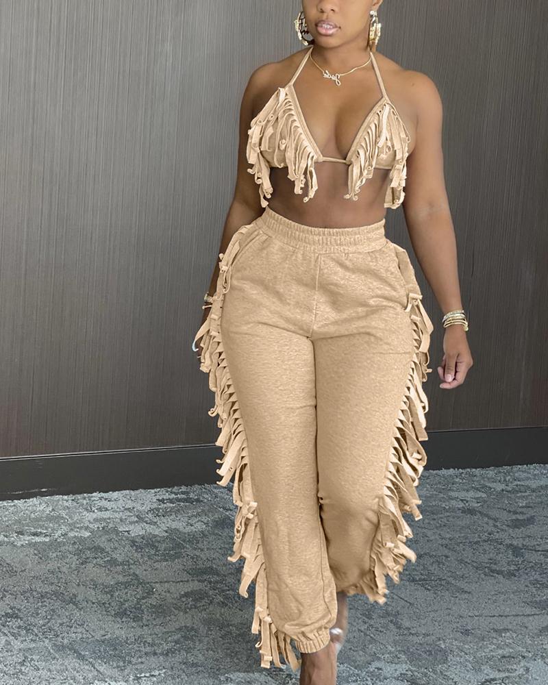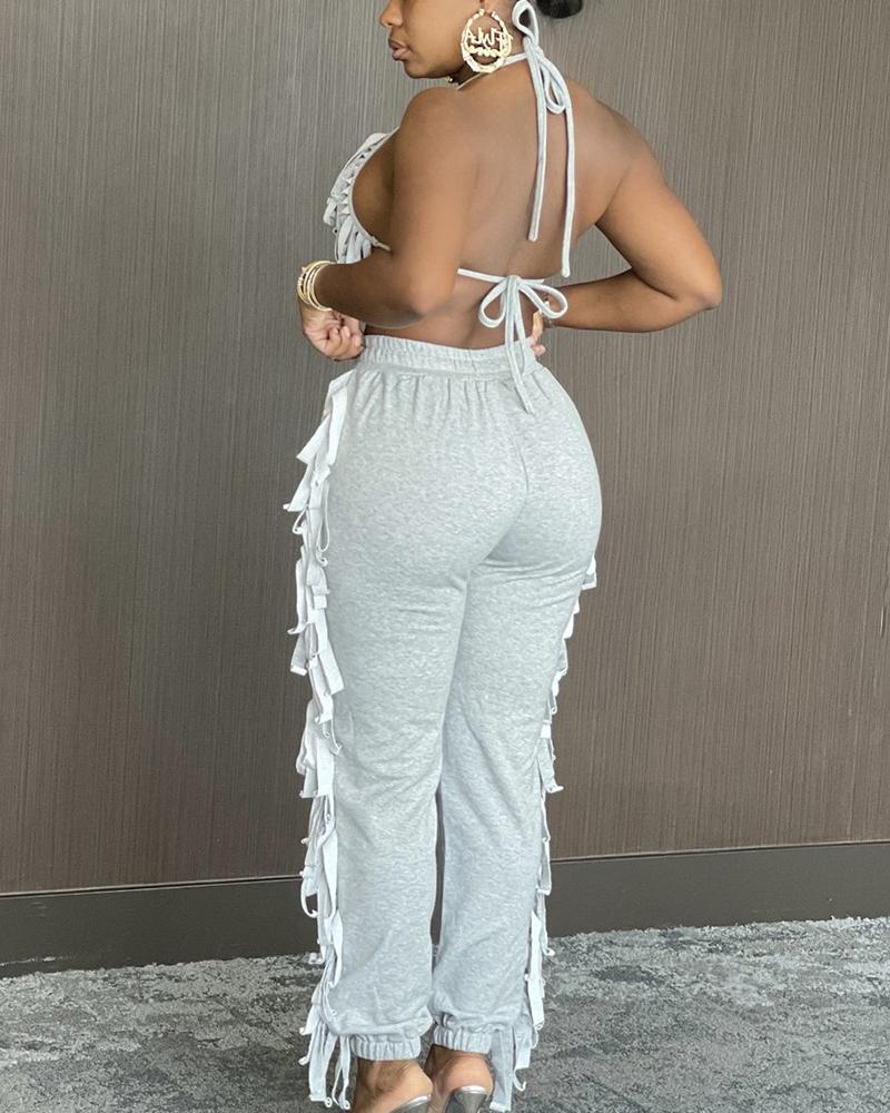Solid Fringe Self-Tie Halter Top & Pants Set