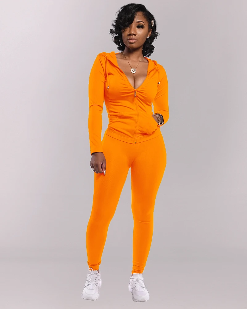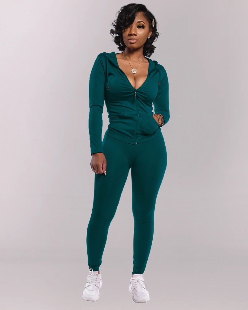 Solid Hoodie Zip Front Long Sleeve Top & Pants Set