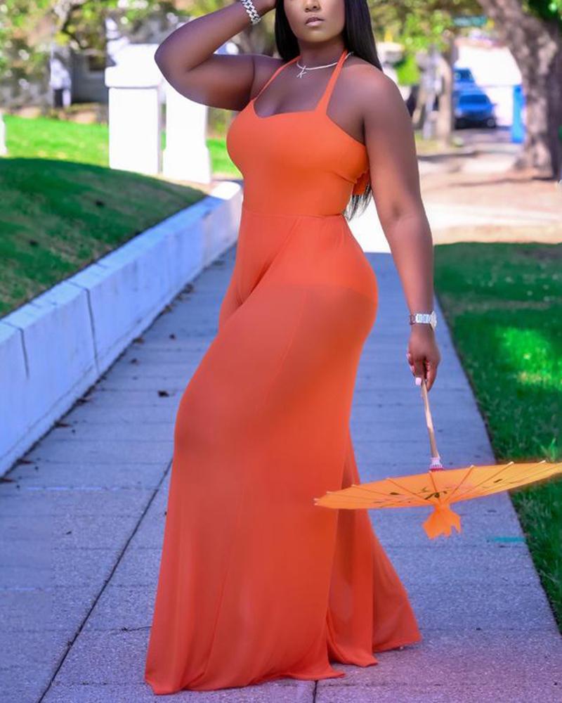 Solid Mesh Halter Wide Leg Casual Jumpsuit