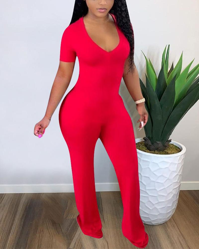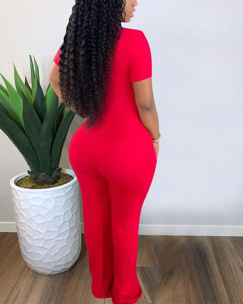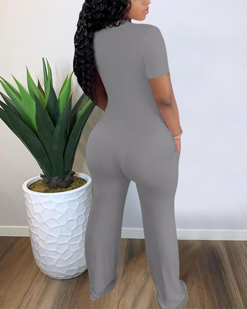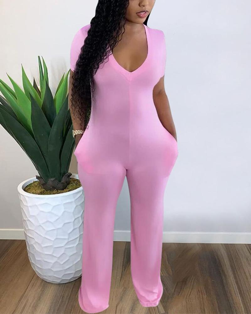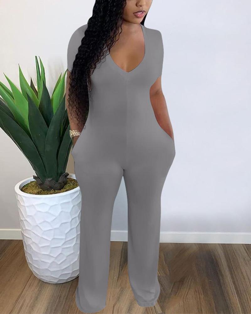 Solid Pocket Detail Short Sleeve Casual Jumpsuit