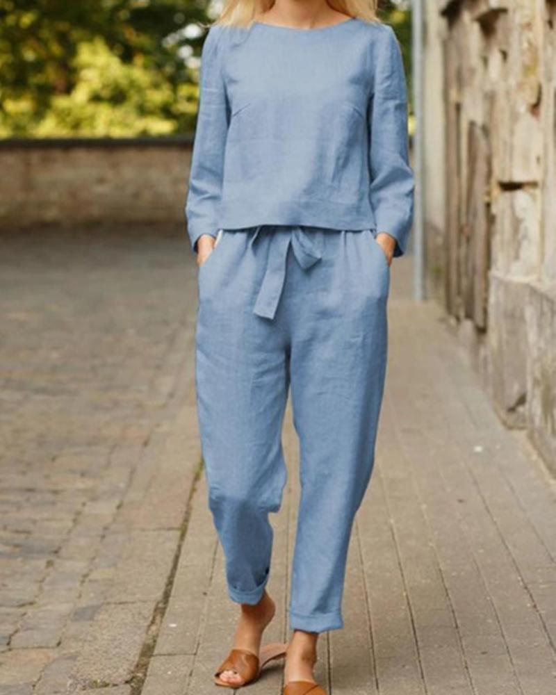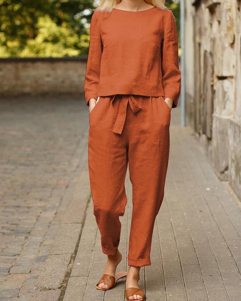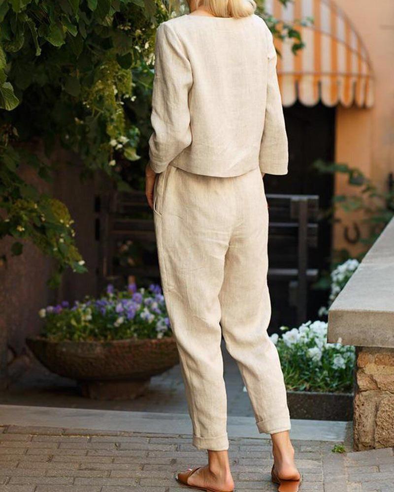 Solid Pocket Detail Tie Front Tee & Pants Set