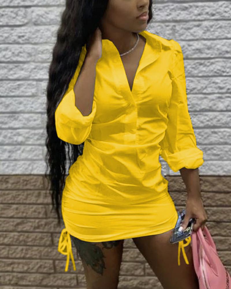 Solid Ruched Drawstring Button Front Mini Shirt Dress