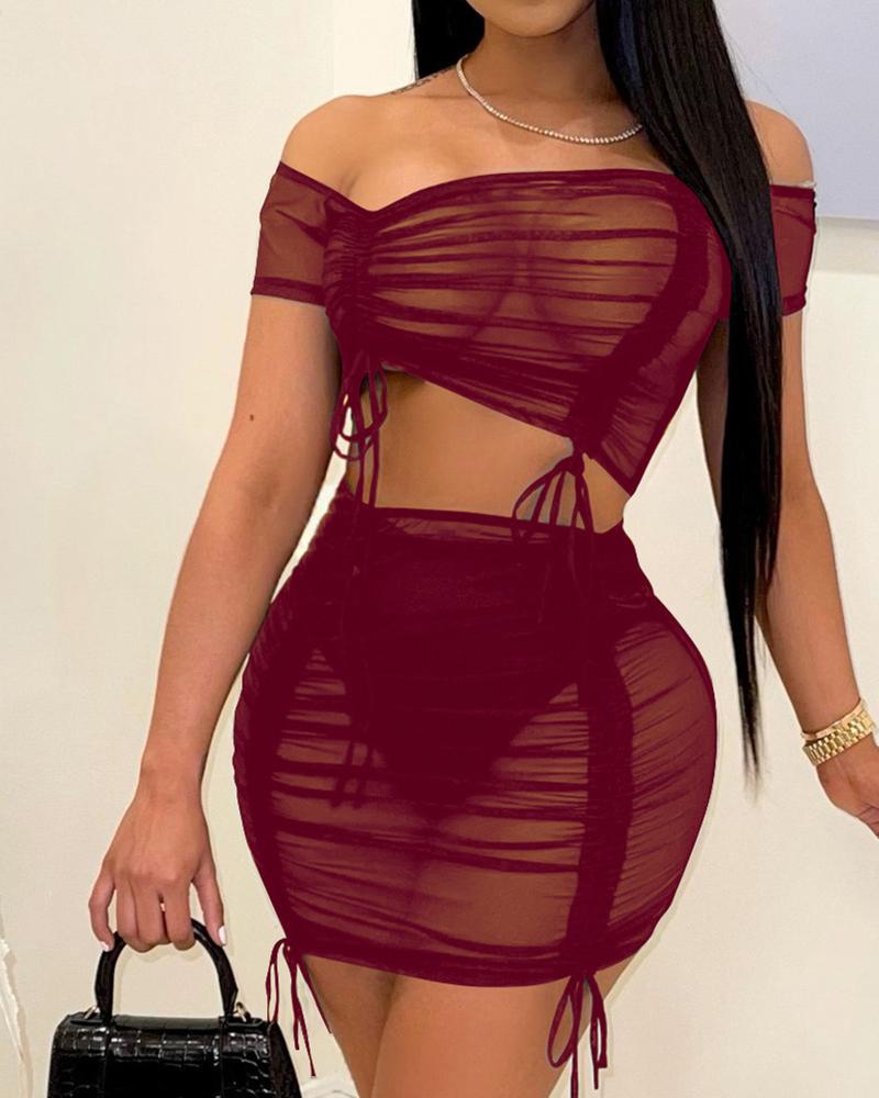 Solid Sheer Drawstring Front Top & Skirt Set Without Panty
