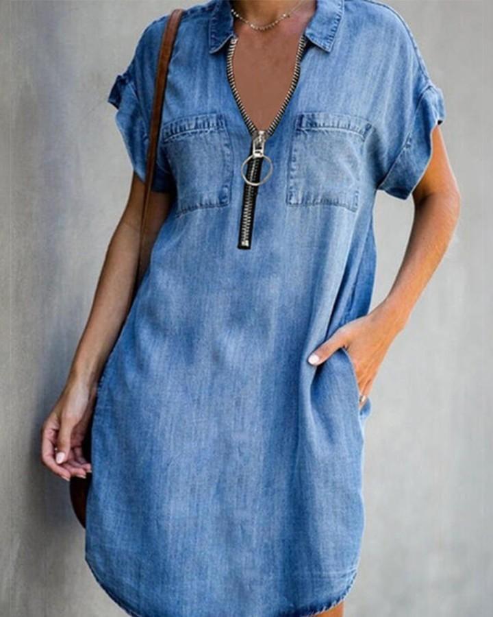 Solid Short Sleeve Loose Denim Mini Dress