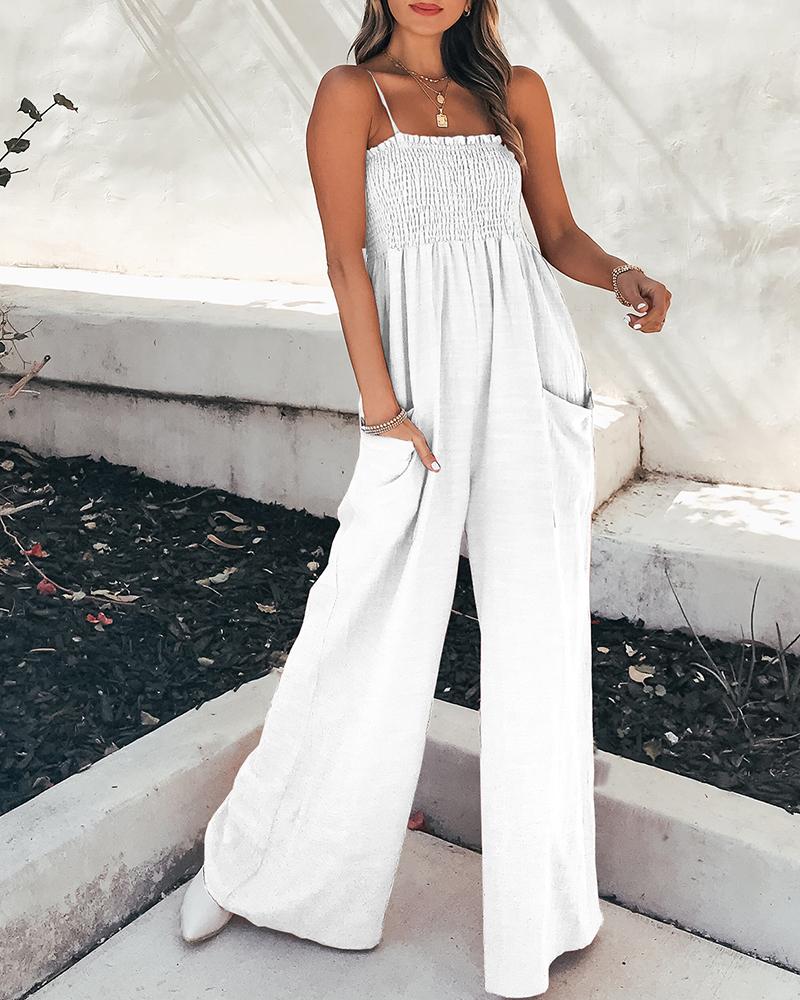 Solid Smocked Pocket Detail Cami Wide Leg Casual Jumpsuit