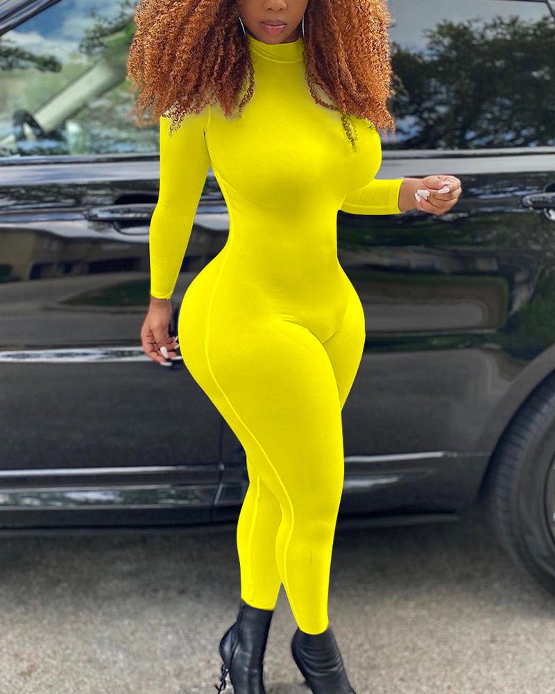 Solid Zip Back High Neck Form Fitting Casual Jumpsuit