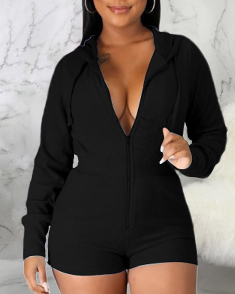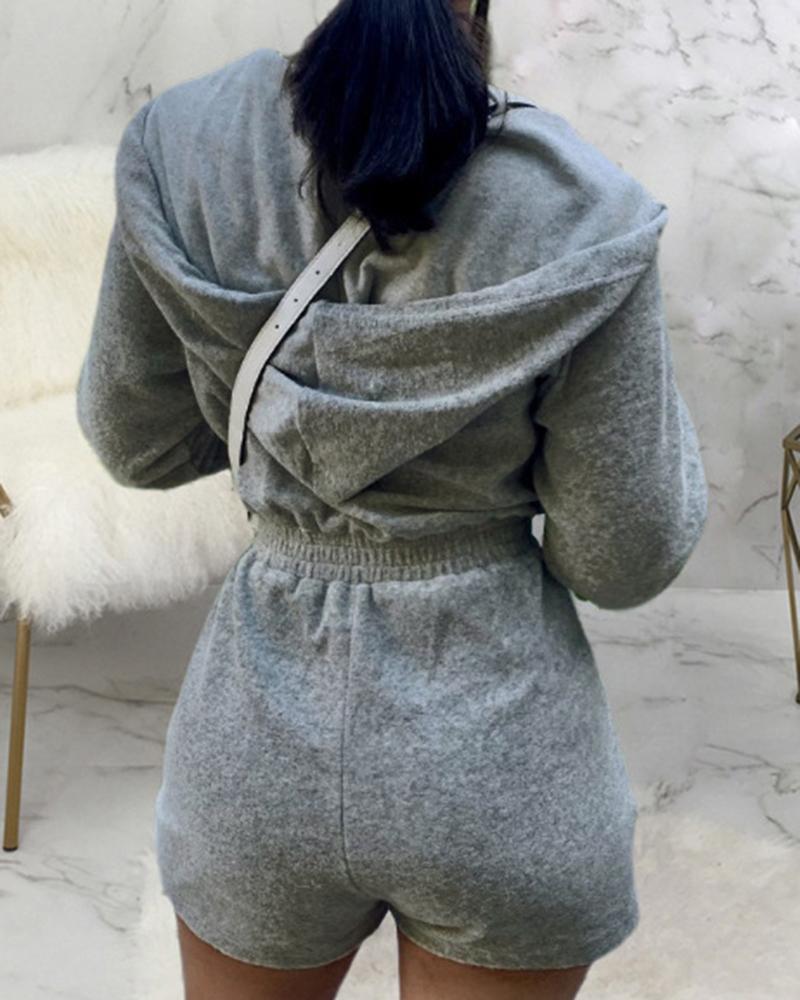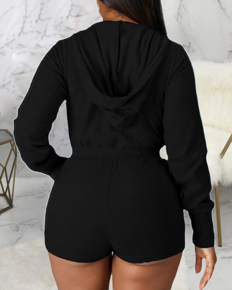 Solid Zip Up Drawstring Detail Hooded Casual Romper