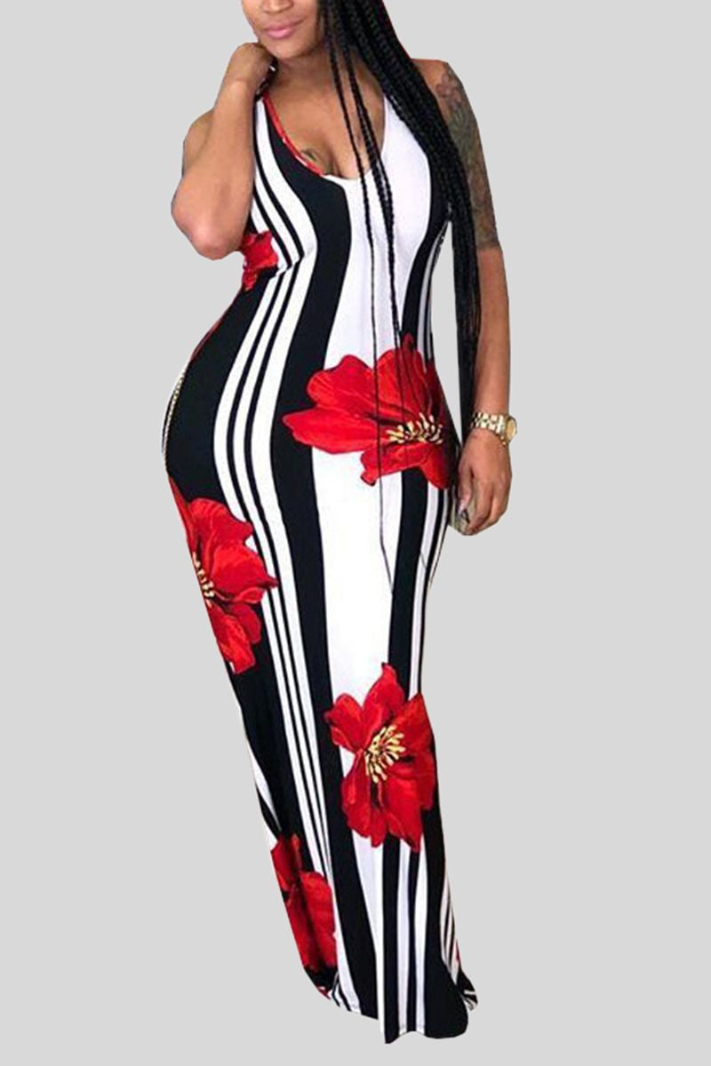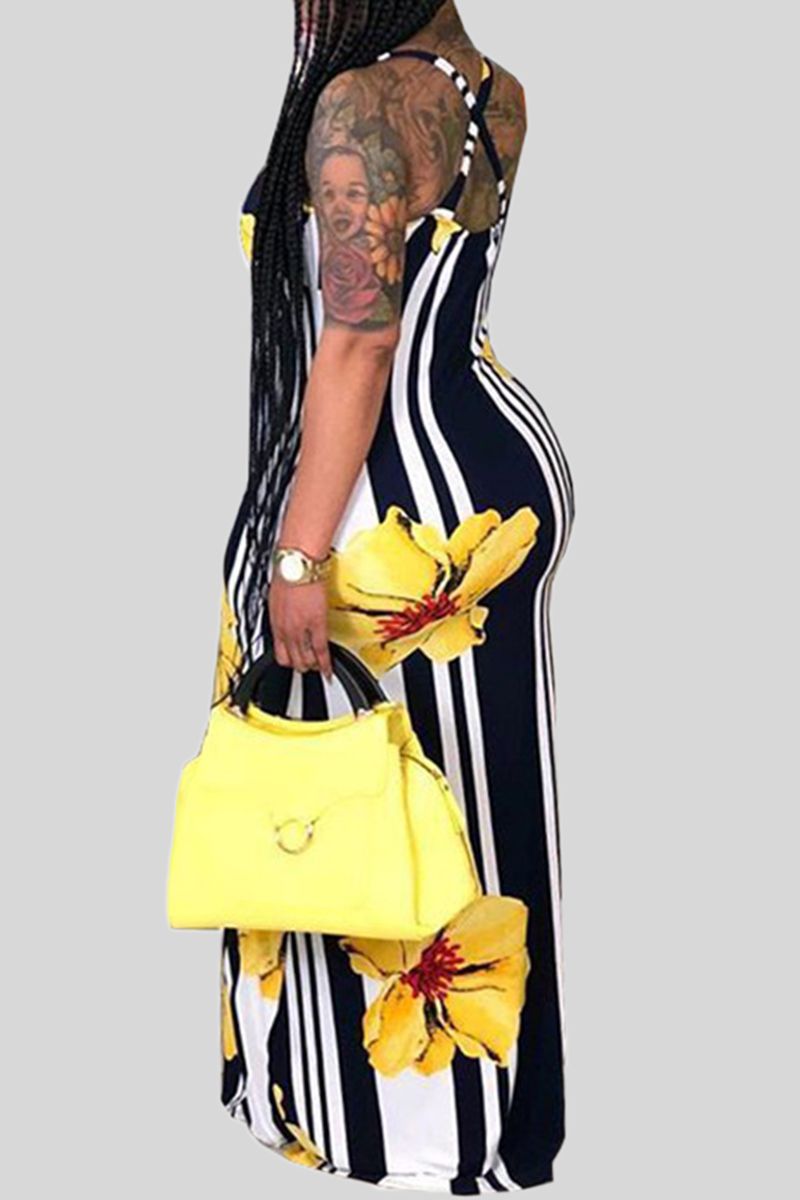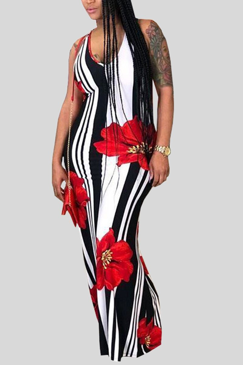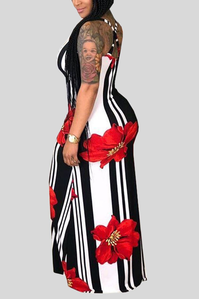 Stripe Floral Print Criss Cross Back Maxi Dress