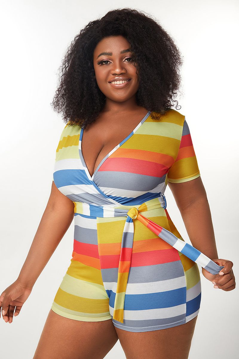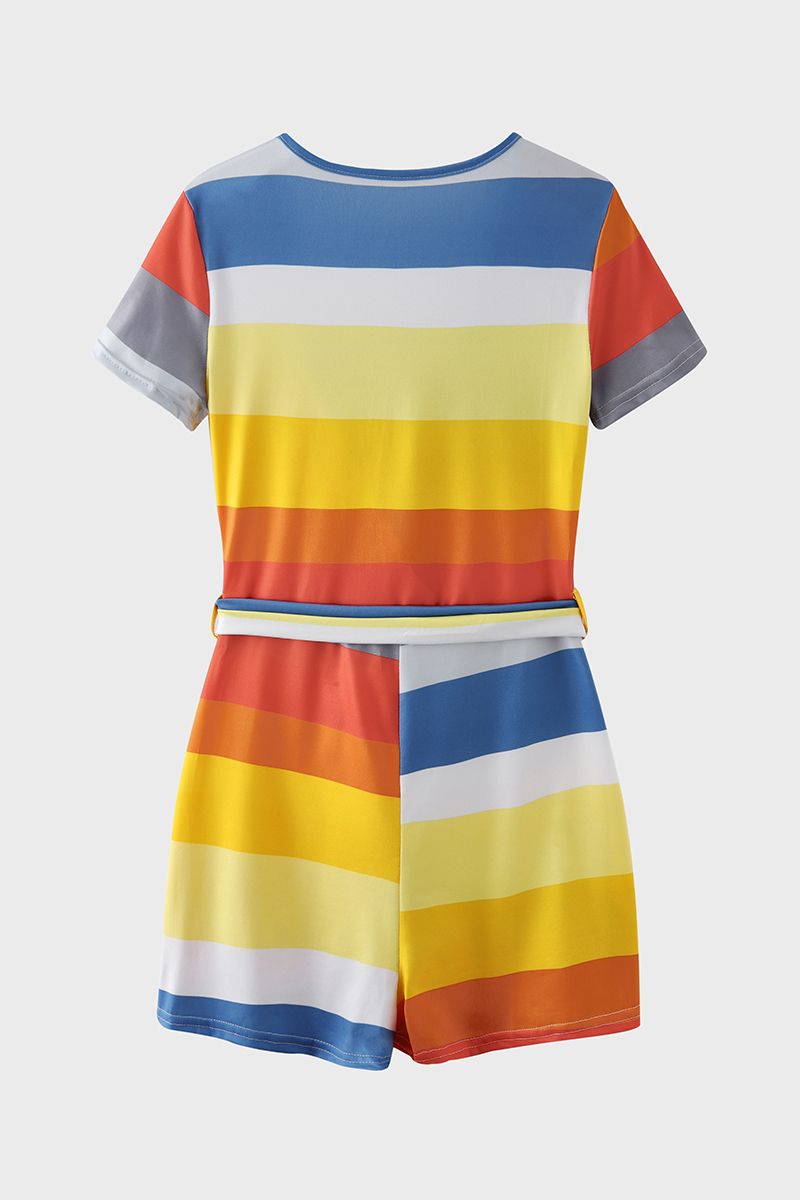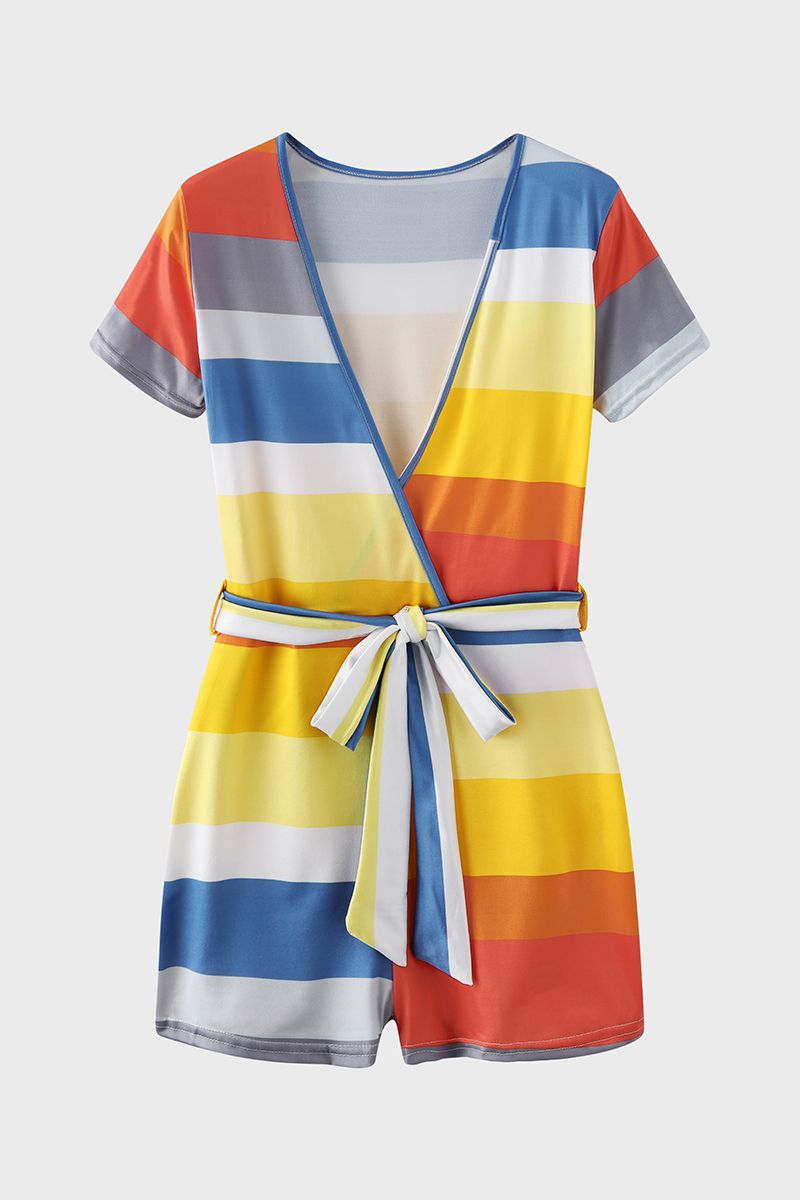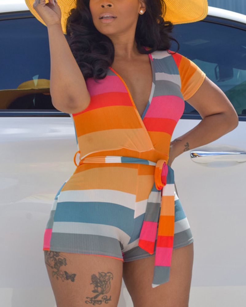Striped Belted Surplice Neck Romper