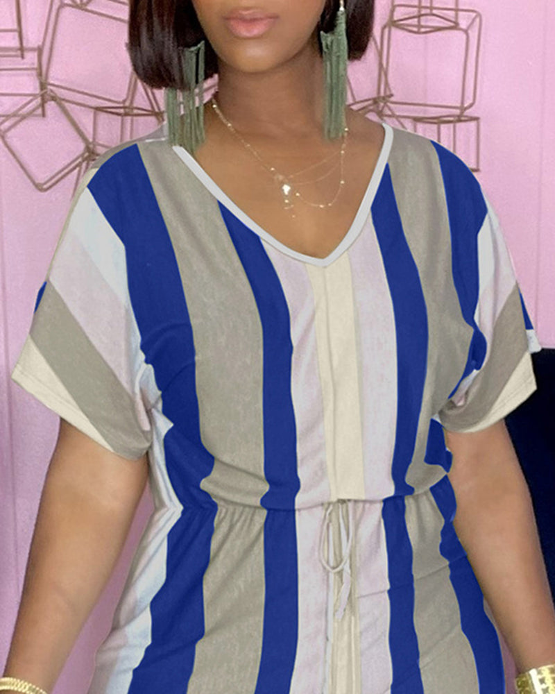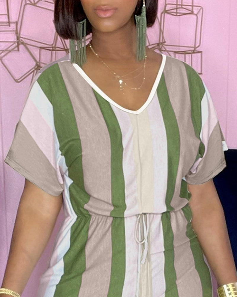 Striped Short Sleeve Drawstring Waist Romper