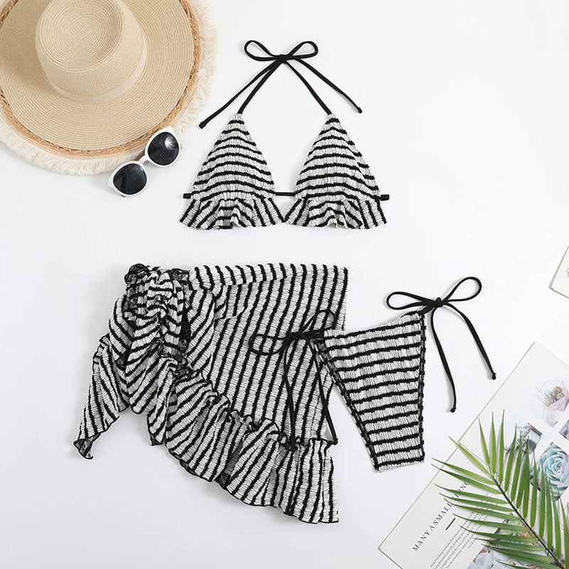 Striped Textured Tie String Ruffle Slide Triangle Halter Brazilian Three Piece Bikini Swimsuit