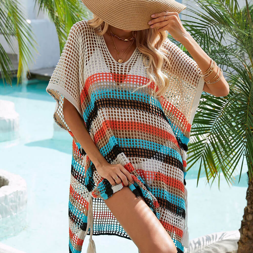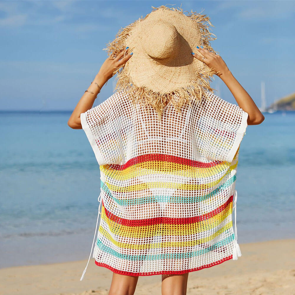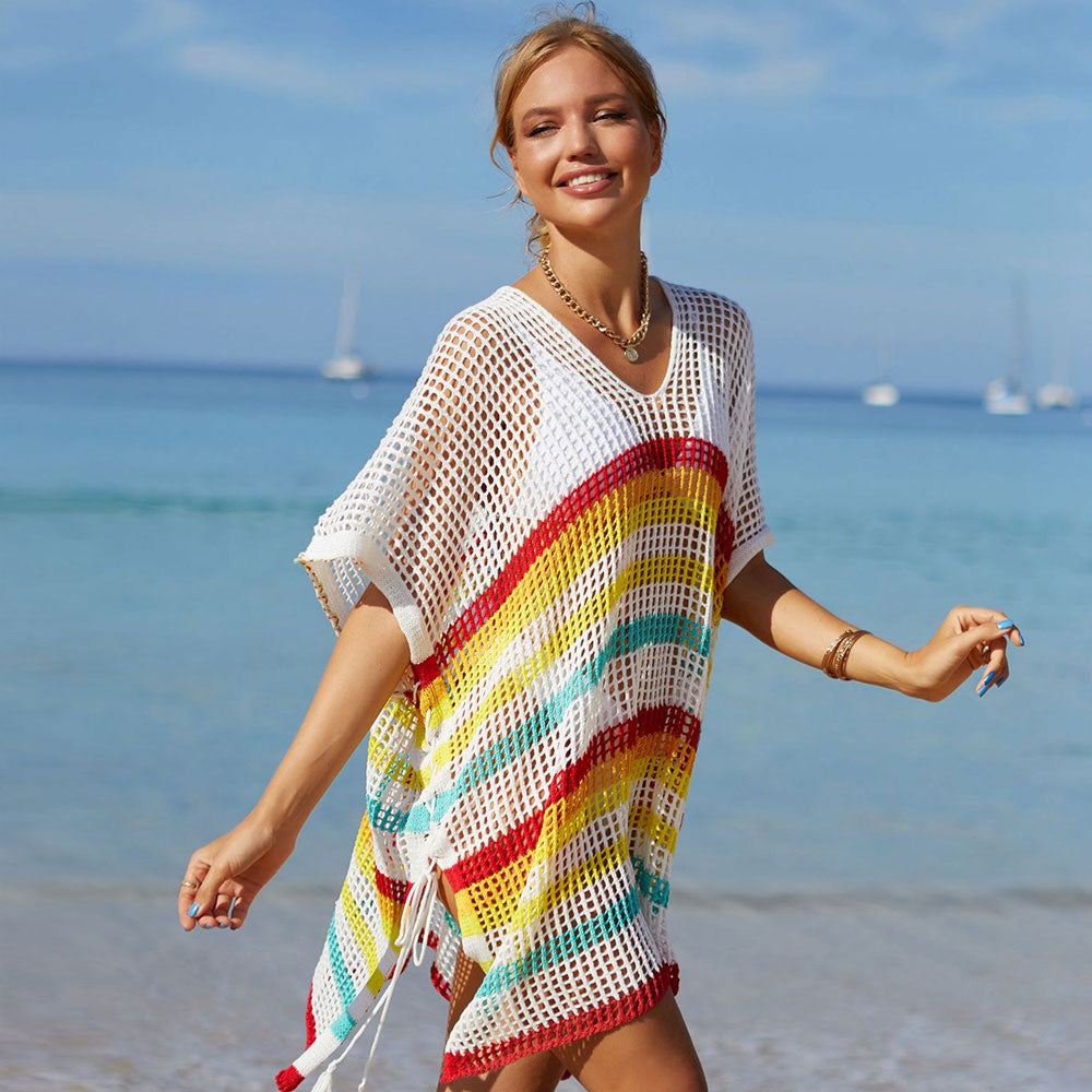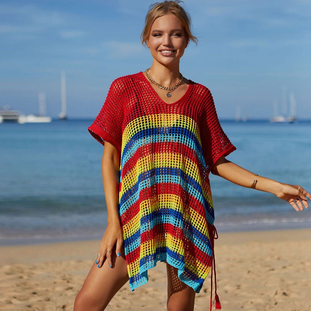 Look like a summer ray of sunshine with our boho chic cover up dress! Show off your 'gram-worthy style with its daring V-neckline, wide short sleeves, and comfortable side slits. The voluminous boxy fit, enhanced by simple wide stitching of the yarn, provides a relaxed and comfortable feel. Rainbow multicolor stripes let you mix & match with your favorite beach looks! Grab it before it's gone! Embrace the spirit of summer with this lively and fashionable vintage style beach tunic.