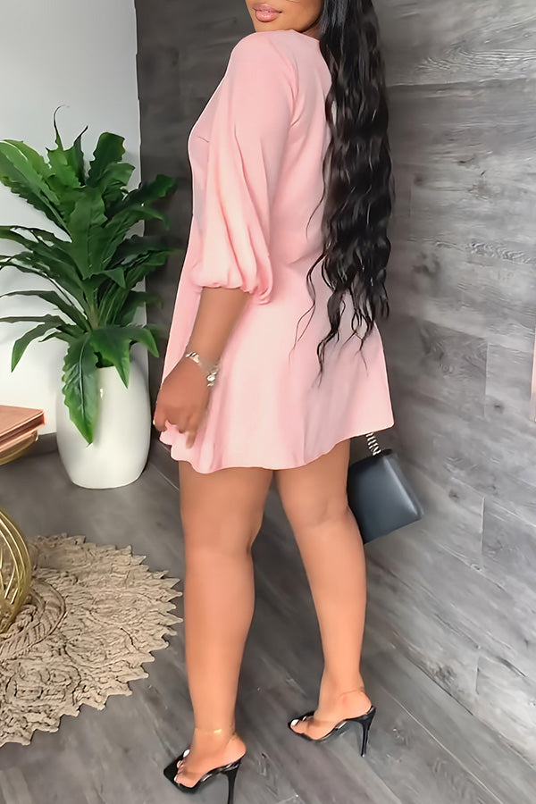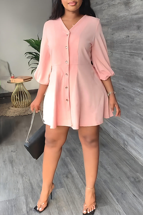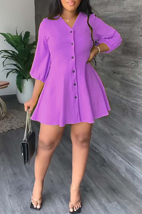 Temperament Solid Color V-neck Half Single Breasted A-Line Mini Dress