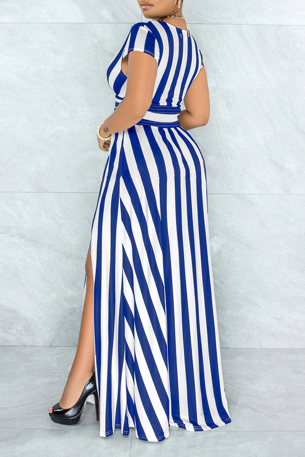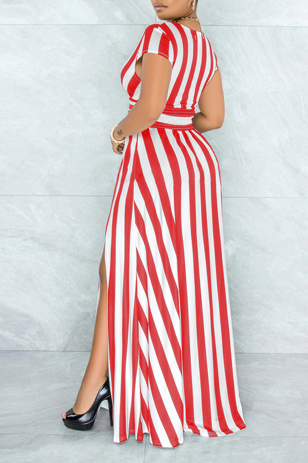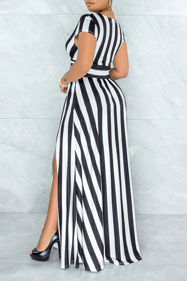 Temperament Stripe Print Short Sleeve V-neck Slim Fit Slit Maxi Dress