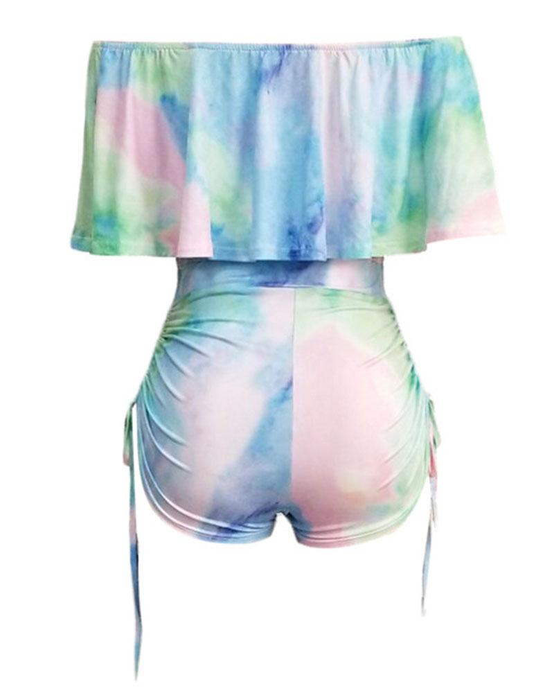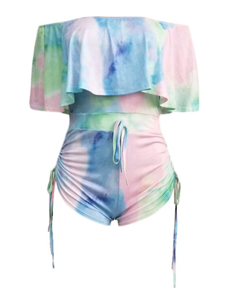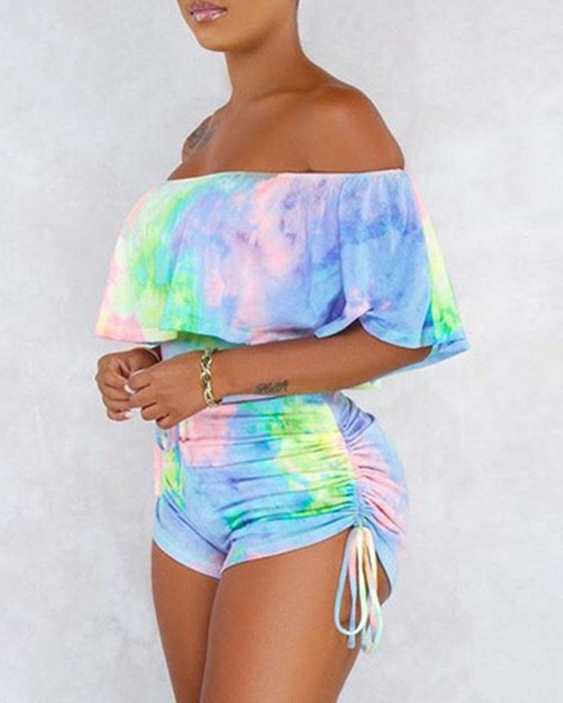 Tie Dye Drawstring Ruched Ruffle Hem Off Shoulder Casual Romper