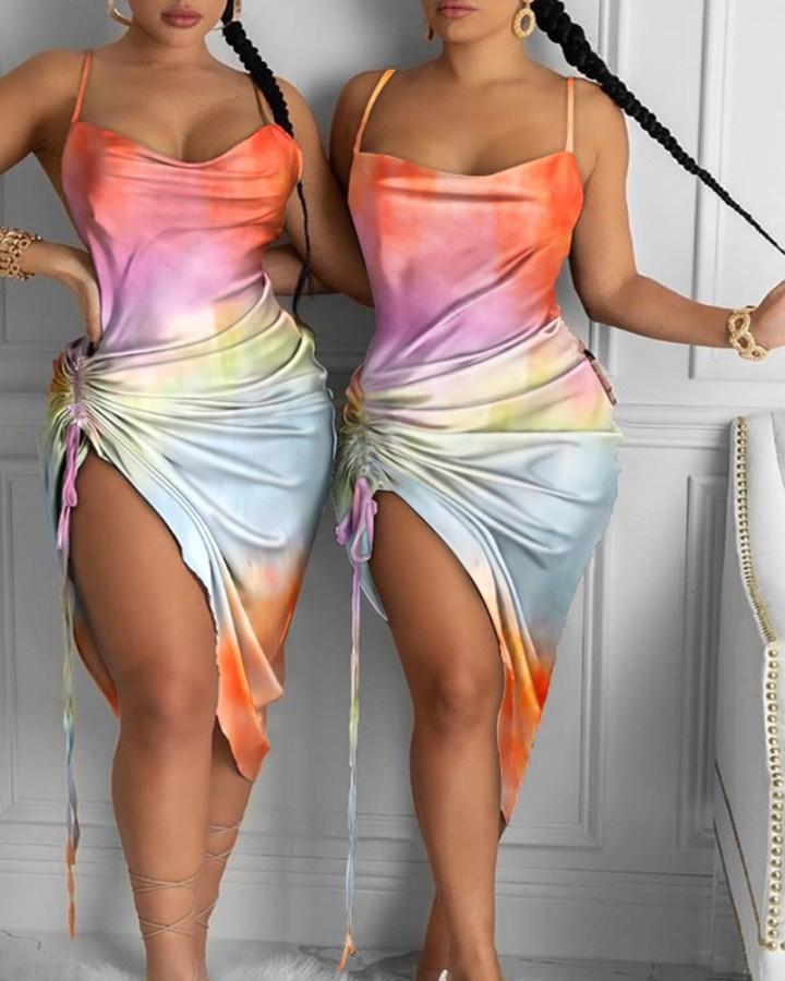 Tie Dye Print Drawstring Ruched Party Dress