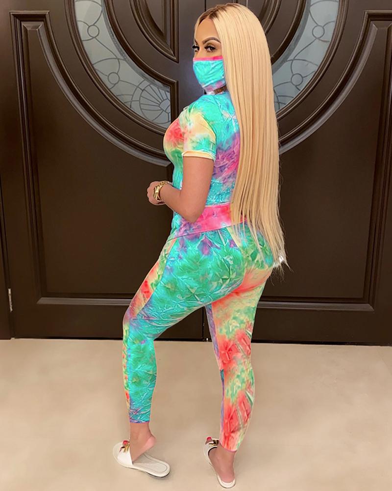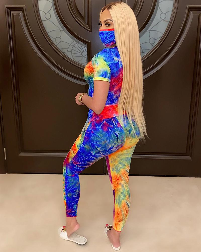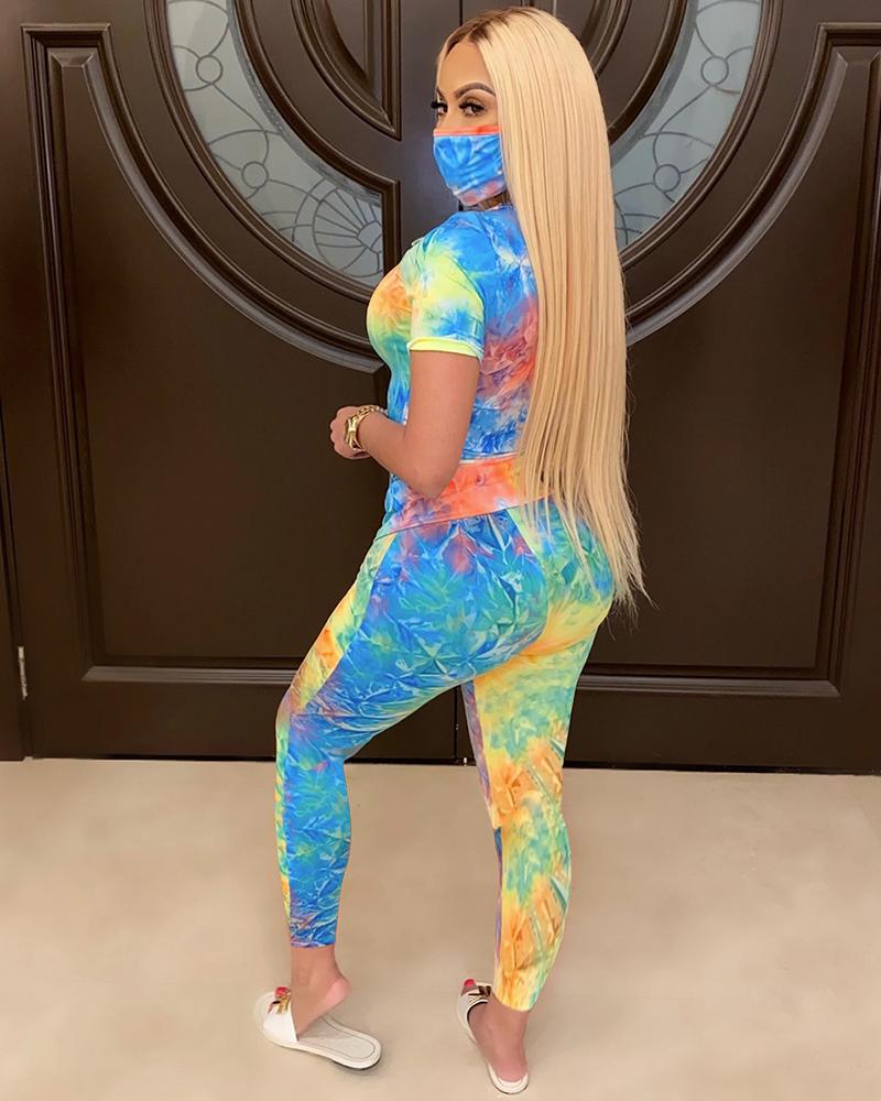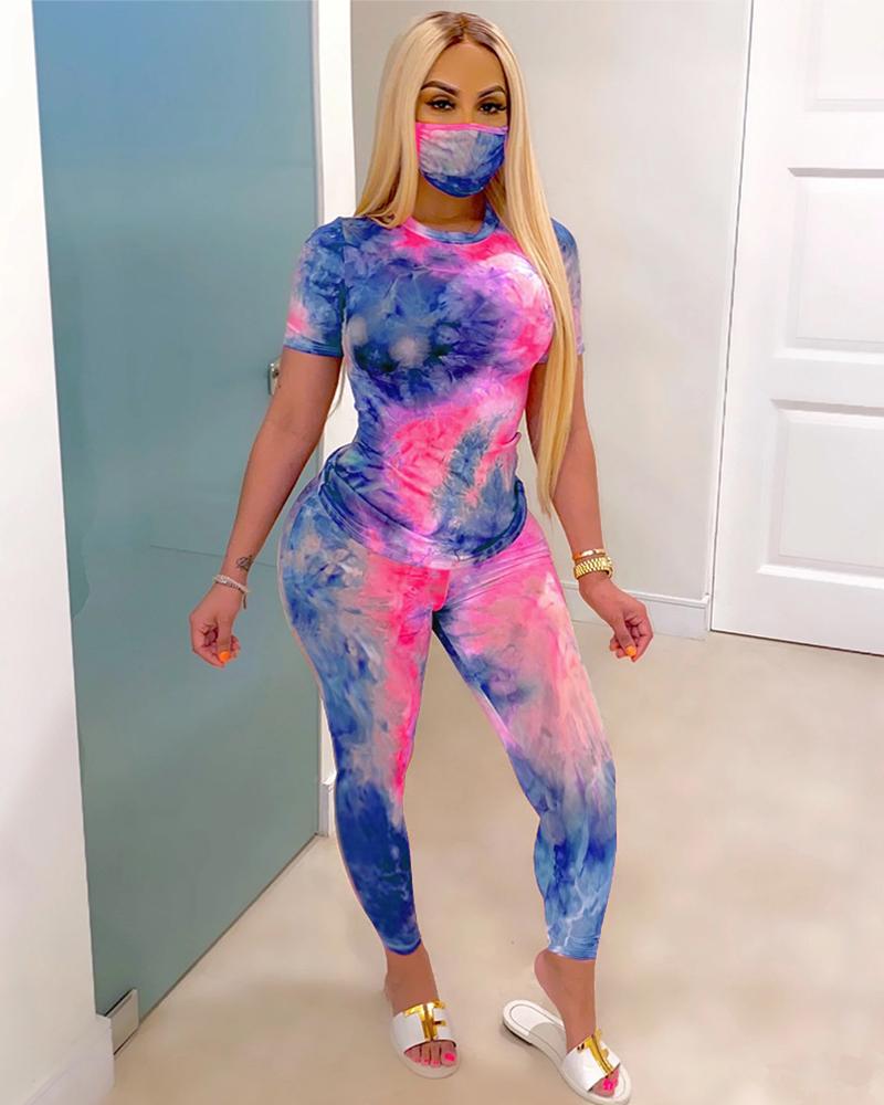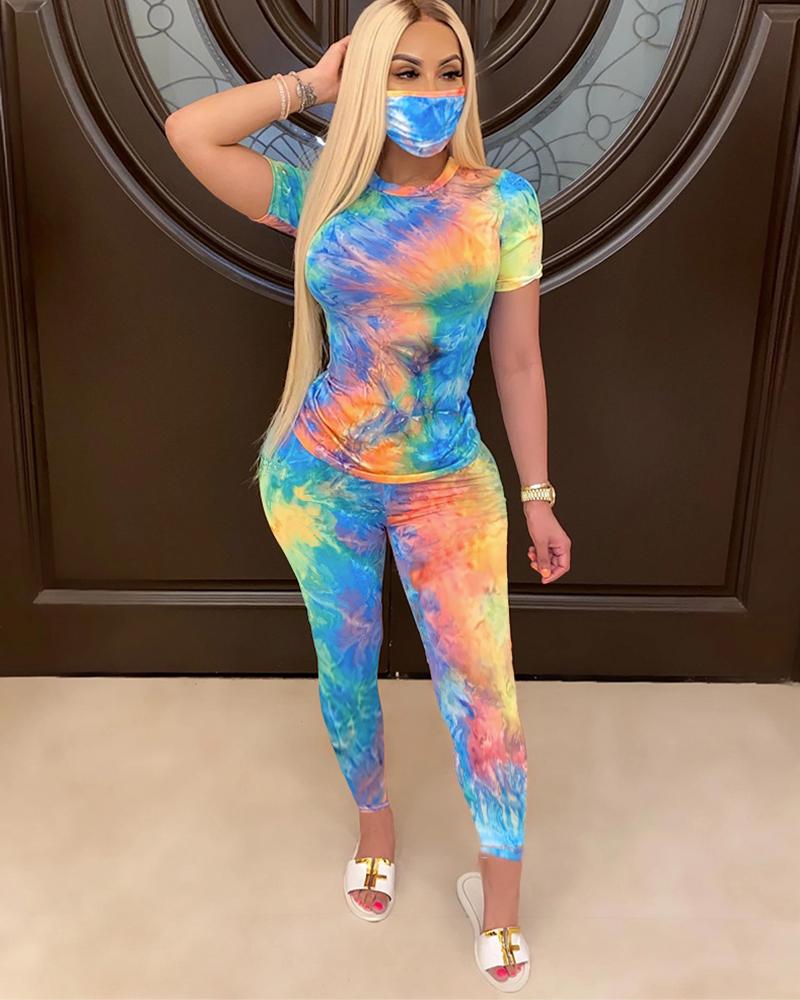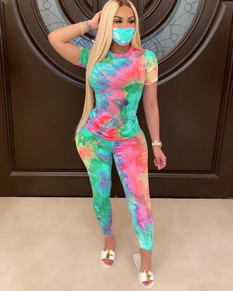 Tie Dye Short Sleeve Top & Pants Set With Mask