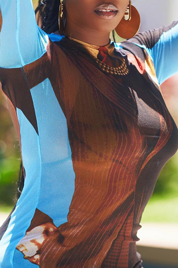 Trendy Suit Pattern Print Backless Round Neck Long Sleeve Maxi Dress