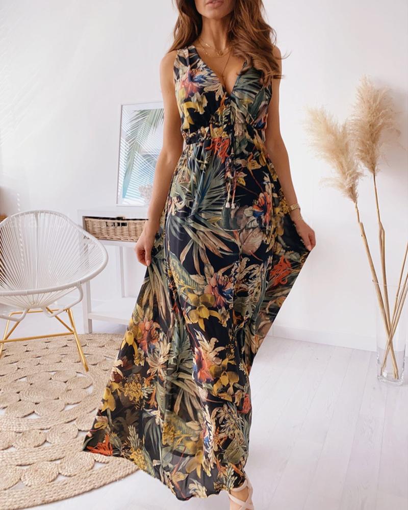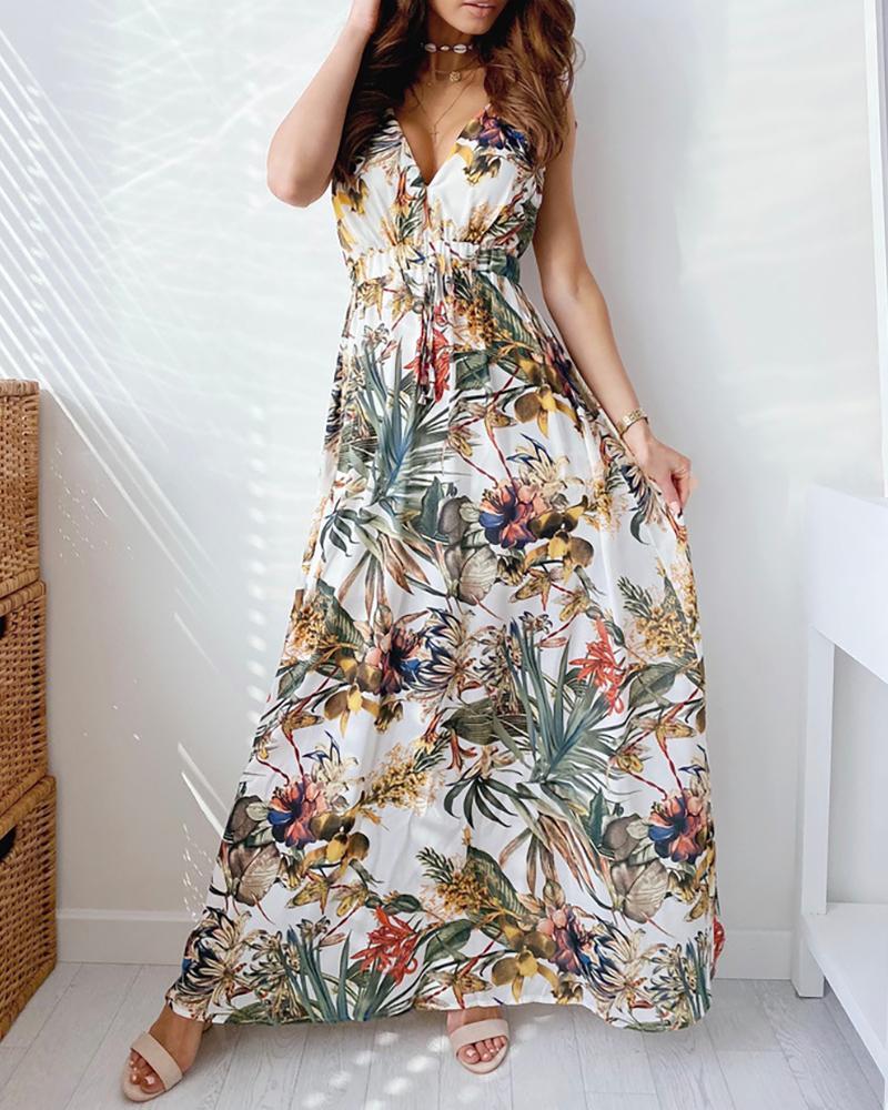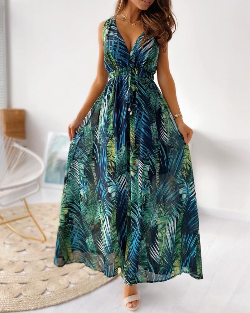Tropical Print Tied Detail Cutout Back Maxi Dress