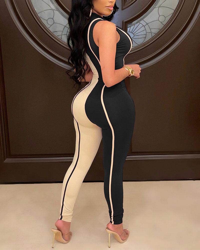 Two Tone Striped Zip Up Sleeveless Casual Jumpsuit