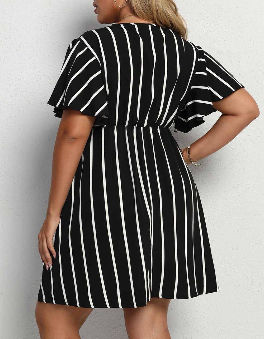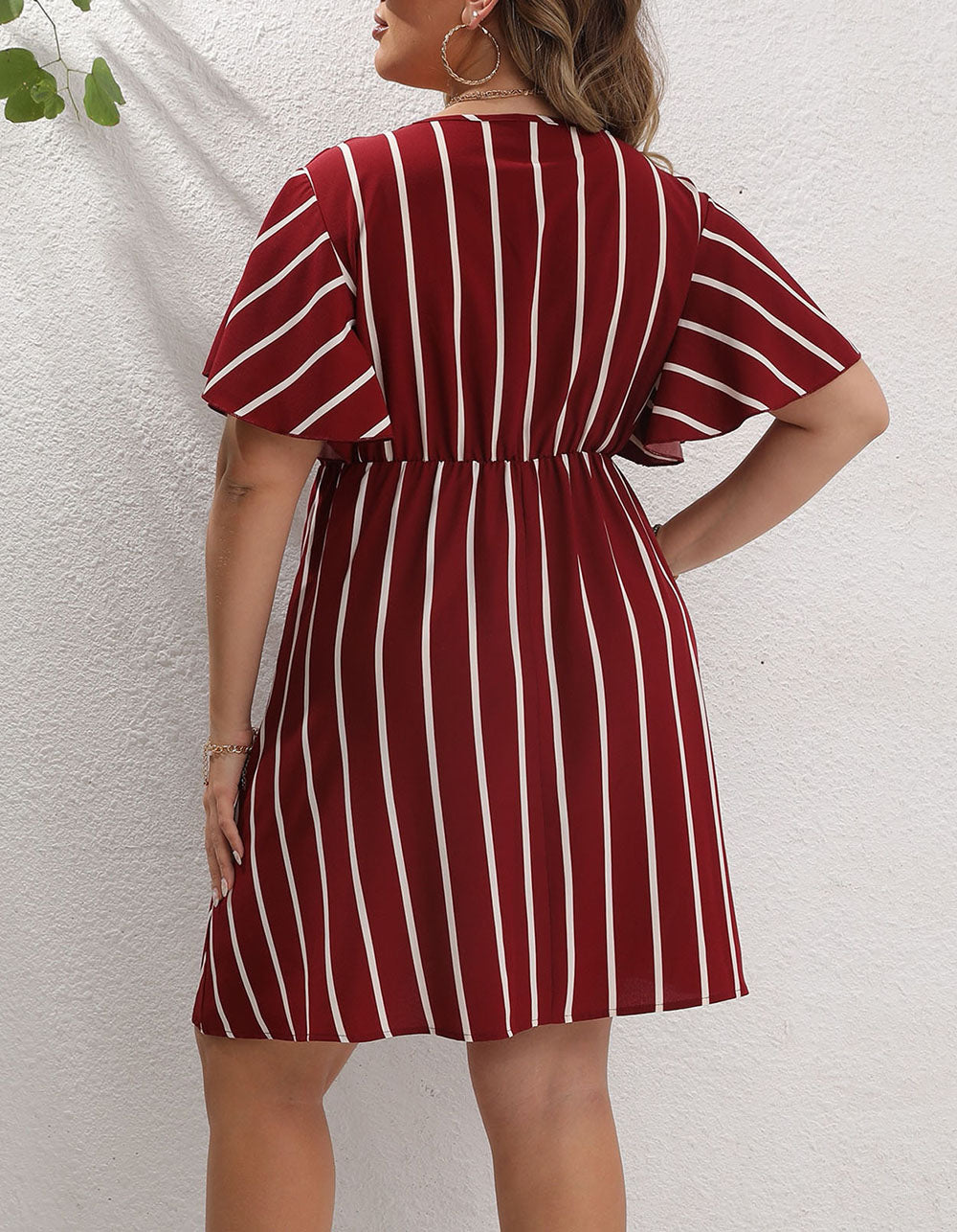 This V Neck Plus Size Striped Loose Short Sleeve A-Line Dress is designed for maximum comfort and flattering fit. It features a striped pattern with a printed detail and a V neckline for an elegant look. The dress is made of polyester with a slight stretch and has a high-waisted A-line fit, short ruffle hem, and regular short sleeves for a comfortable and stylish look.