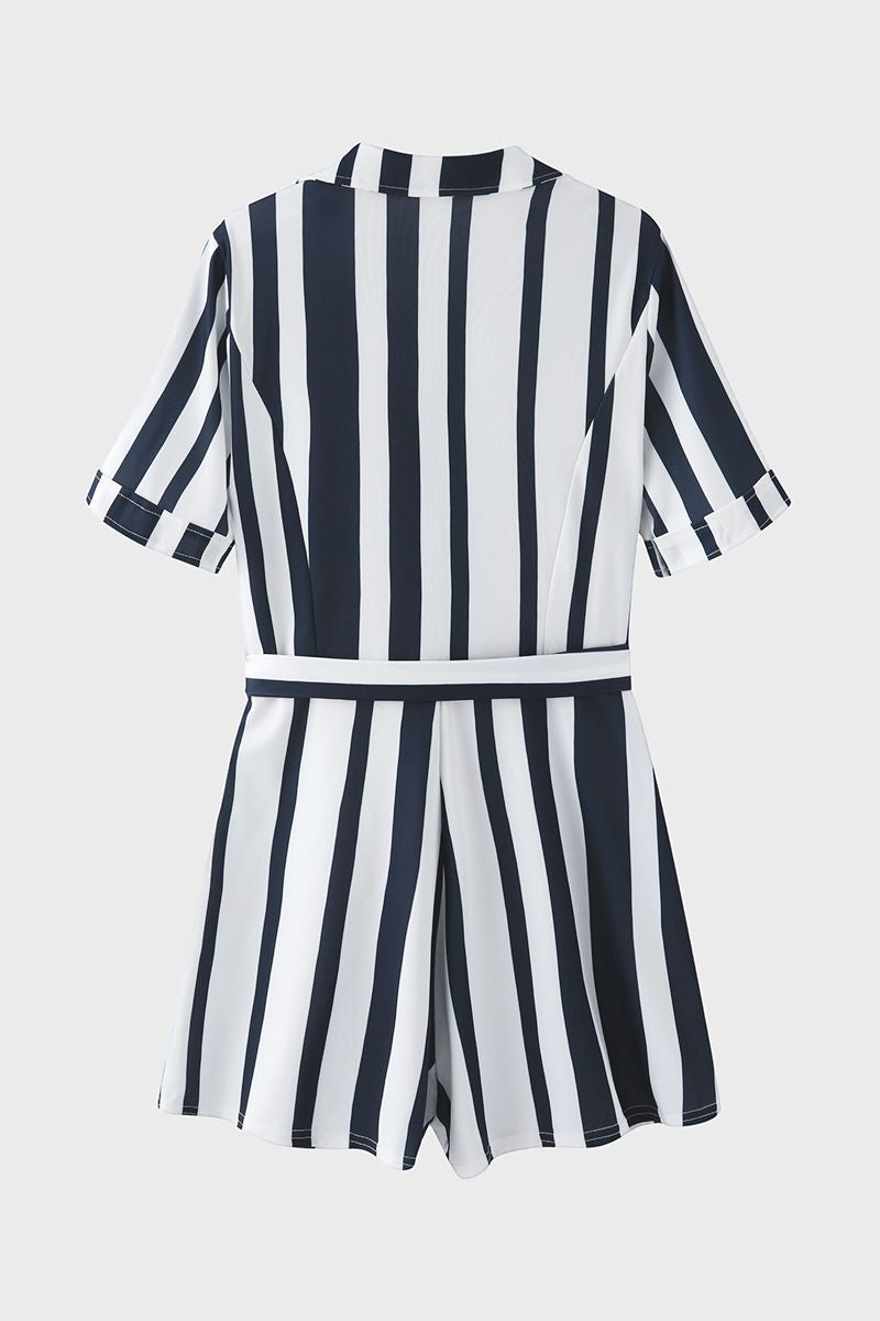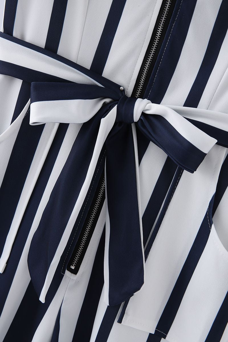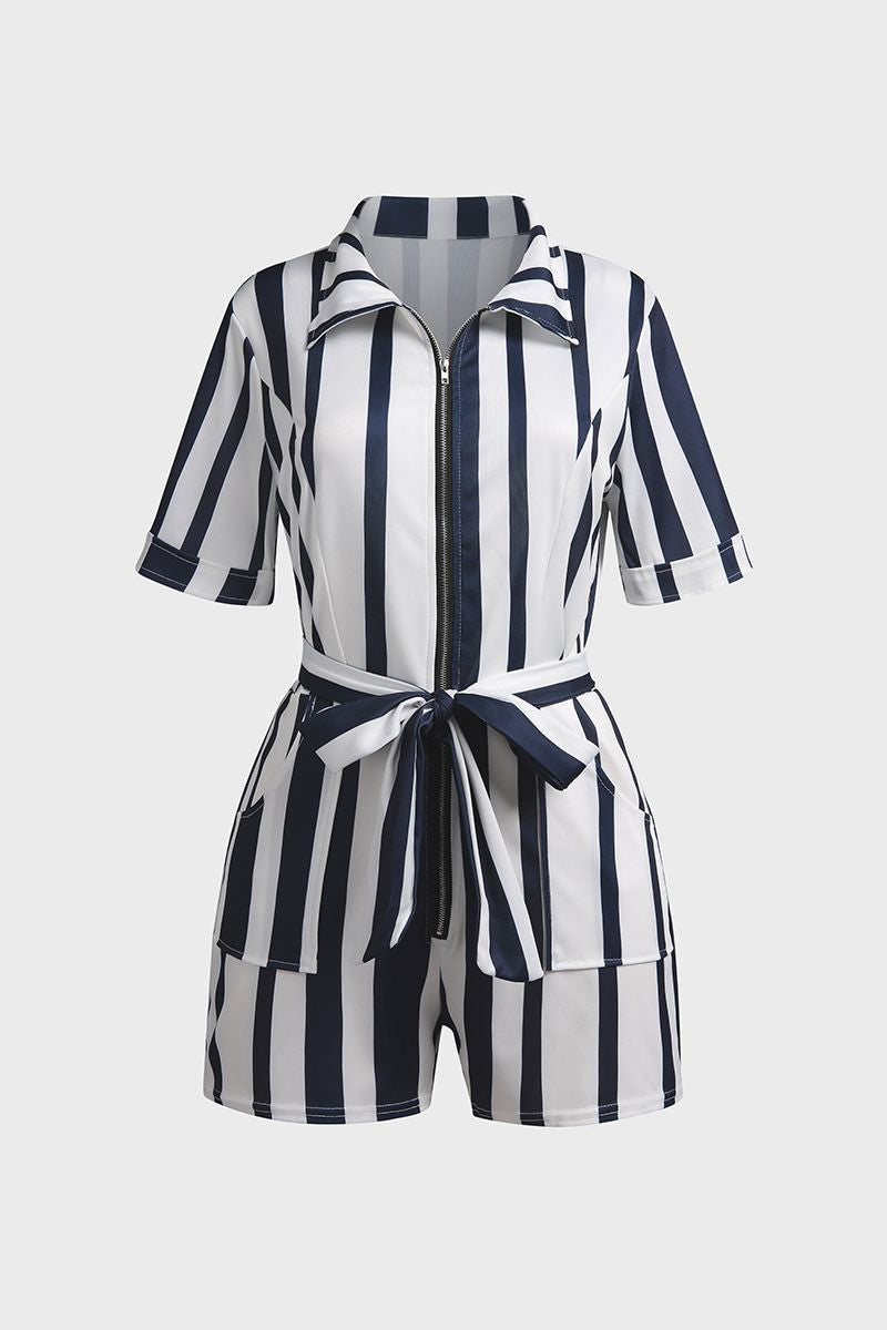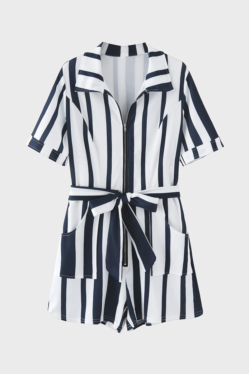 Vertical Stiped Belted Zip Front Romper