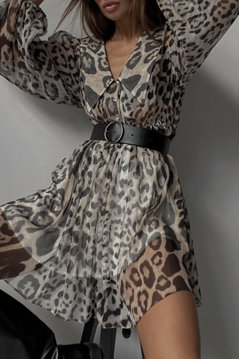 Vintage Elegant Leopard Patchwork With Belt Turndown Collar A Line Dresses