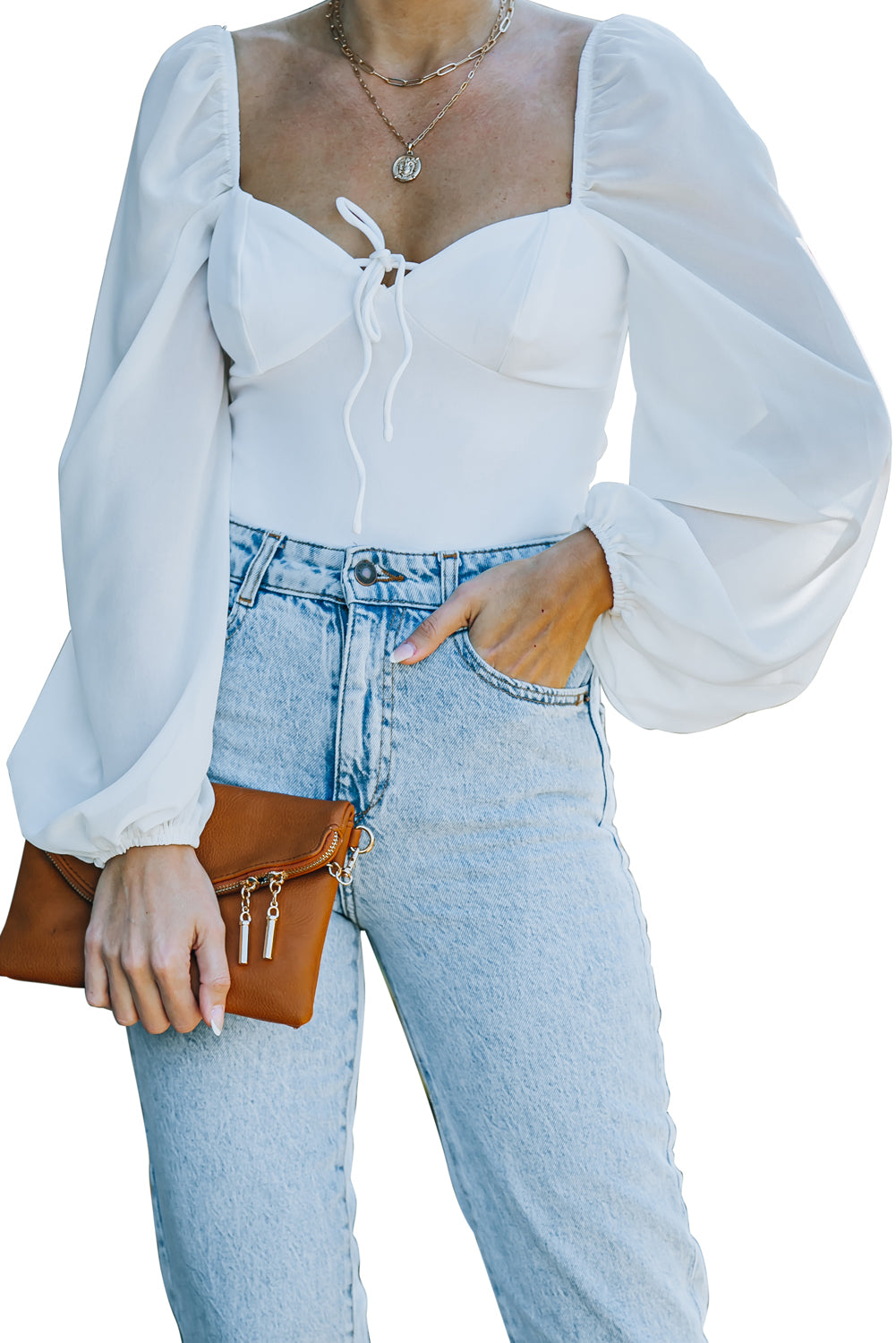 White Criss Cross Backless Puff Sleeve Bodysuit